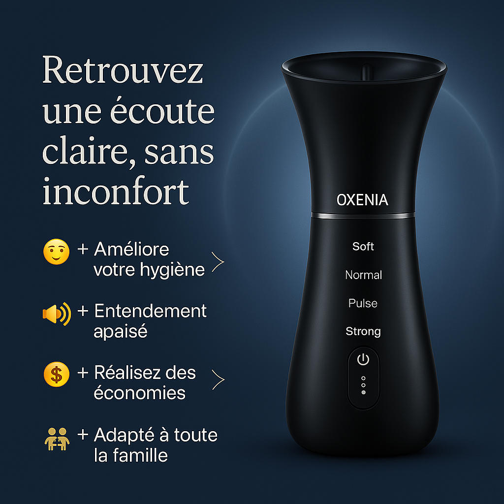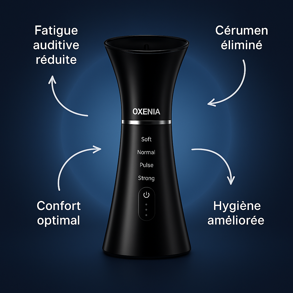 Oxenia™ révolutionne le nettoyage auriculaire avec son système à jet d’eau précis et indolore. Résultat : une sensation de fraîcheur et de légèreté instantanée, comme après une séance chez le spécialiste mais depuis chez vous.